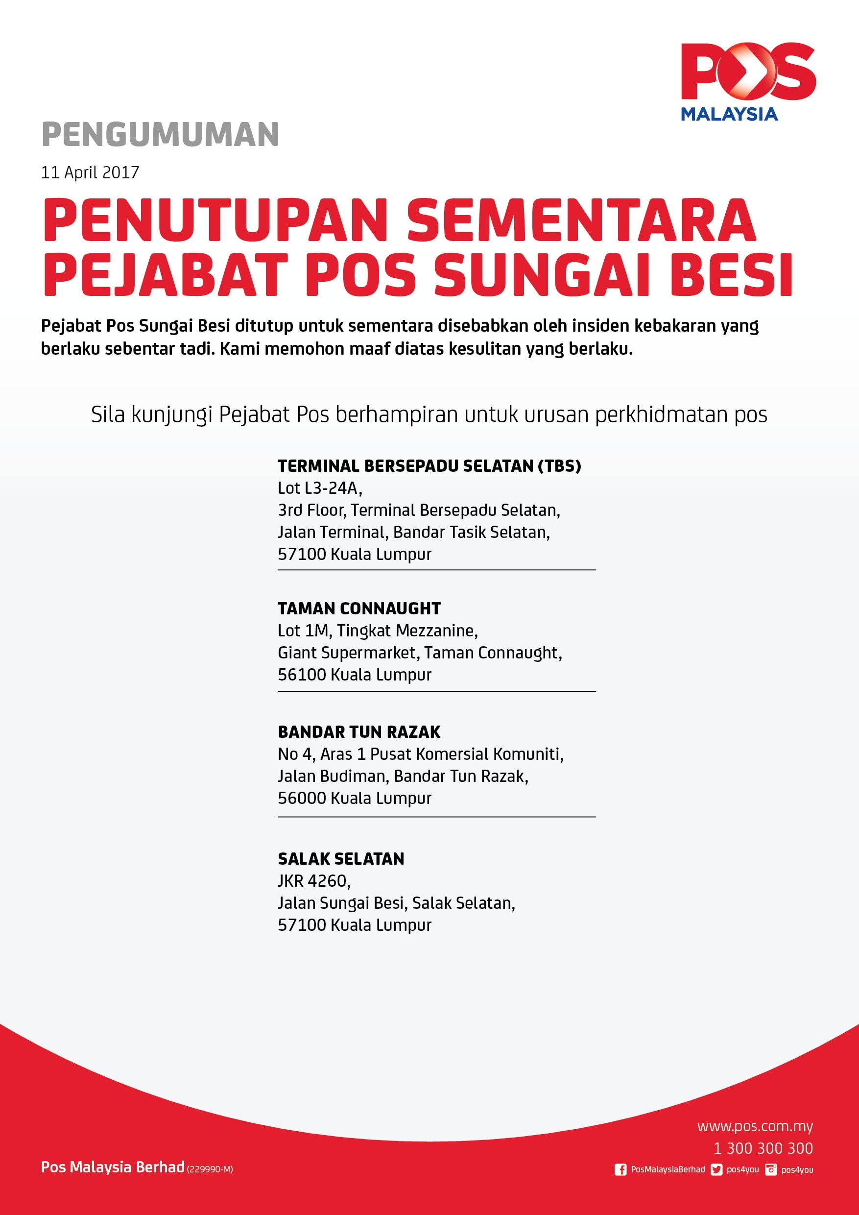 تويتر Pos Malaysia Berhad على تويتر Pengumuman Penutupan Sementara Pejabat Pos Sungai Besi Https T Co G2sqosrytj